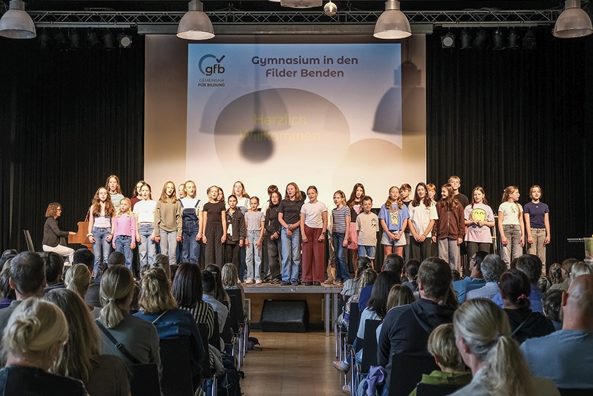Im Anschluss an den Gottesdienst versammelten sich alle Beteiligten in der Aula der Schule, wo die Einschulungsfeier stattfand. Für musikalische Höhepunkte sorgte der Unterstufenchor, der mehrere Lieder mit Begeisterung präsentierte. Ein Gänsehautmoment war die Darbietung des Liedes „My Heart Will Go On“ von Céline Dion. Die stellvertretende Schulleiterin Frau Kanacher, sichtlich selbst beeindruckt, wandte sich mit herzlichen Worten an die neuen Schülerinnen und Schüler. Darüber hinaus stellten sich die Elternvertreter sowie der Förderverein vor. Dieser überreichte dann den Klassen jeweils eine Spielkiste. Mit diesen und dem Klassenleiterteam verließen die Klassen dann die Aula.