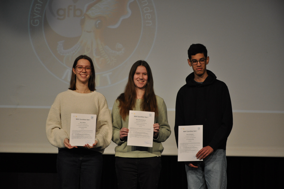 Wir freuen uns sehr darüber, hier mitteilen zu können, dass das GFB am Freitag, den 06.02.2026, zum ersten Mal das MINT-Zertifikat Sek I überreichen konnte. Drei SchülerInnen der ehemaligen 10. Klasse wurden am Tag des Ehrenhäkchens für die 5. und 6. Klassen für ihr so großes Engagement im MINT-Bereich geehrt. Marie Müller, Romy Brecklinghaus und Noah Scherpian haben immer wieder an zahlreichen Wettbewerben teilgenommen, hier teils Preise gewonnen bzw. erste und zweite Plätze belegt, im Profil- und Differenzierungsbereich MINT-Kurse