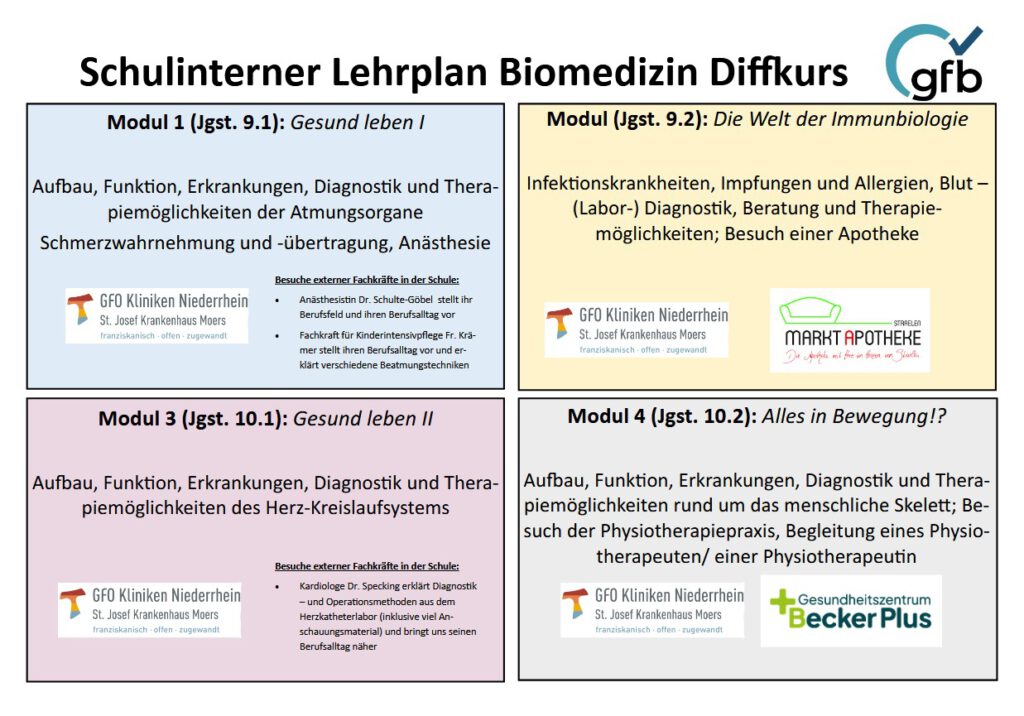 Ein besonderes Highlight sind unsere außerschulischen Lernorte: Wir vertiefen unser Wissen unter anderem im St.-Josef-Krankenhaus, im Gesundheitszentrum BeckerPlus (Schwerpunkt Physiotherapie), in einer Apotheke sowie in einer Pflegeschule. Zusätzlich bereichern Besuche von Ärztinnen und Ärzten, Pflegefachkräften und weiteren Expertinnen und Experten unseren Unterricht und ermöglichen dir wertvolle Einblicke in unterschiedliche medizinische und gesundheitsbezogene Berufsfelder.